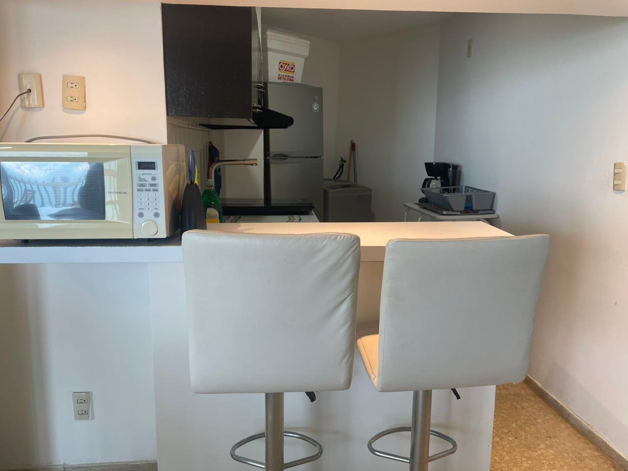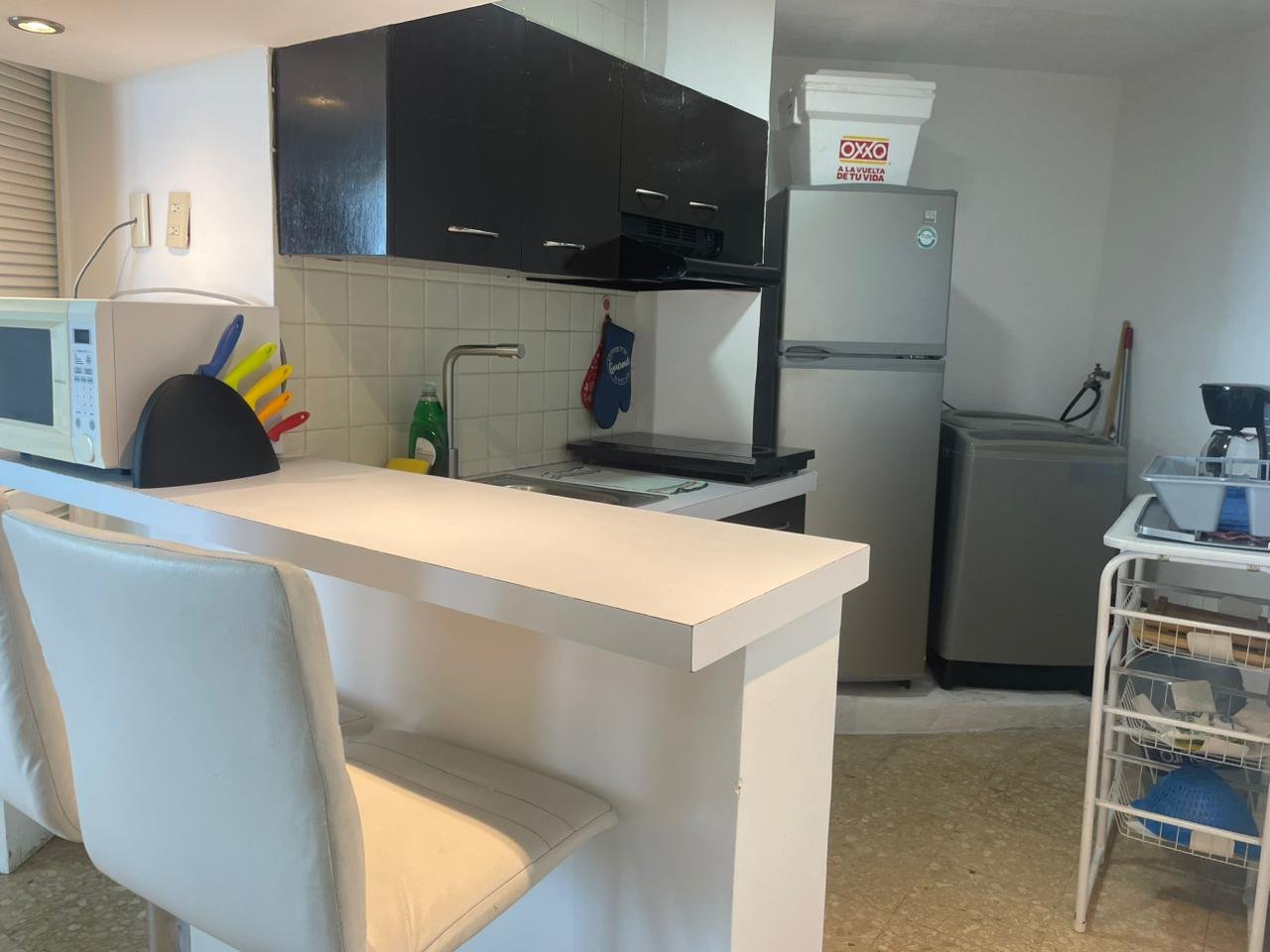 La cocina tiene todo lo necesario para preparar alimentos, refrigerador, una parrilla eléctrica y un horno de microondas, cafetera.